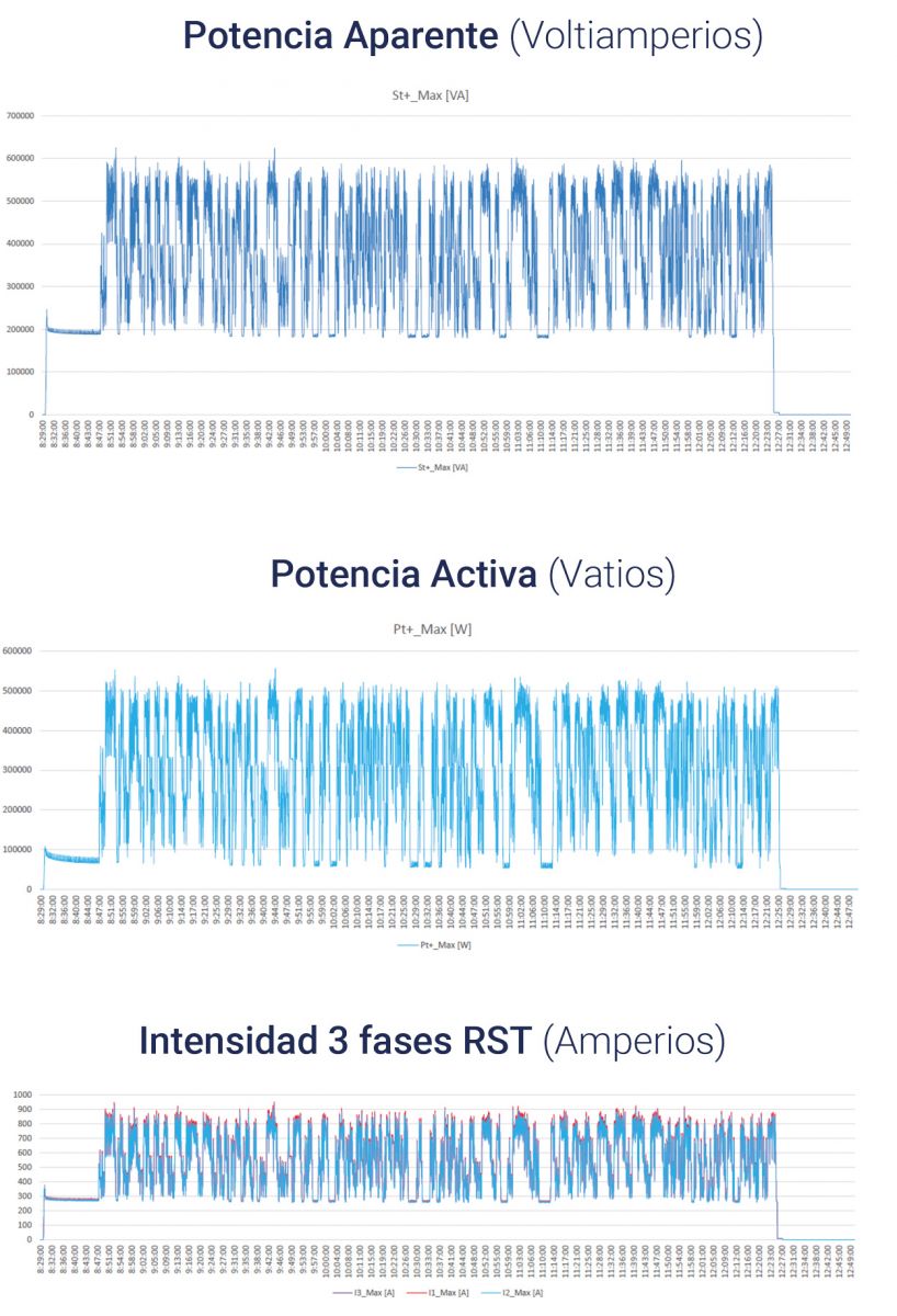 - Por otro lado, se llevó a cabo la colocación de un analizador de redes durante una jornada de trabajo con toda la maquinaria funcionando con normalidad. Con ello, se contrastaron los resultados teóricos y se comprobó el comportamiento de las cargas, tomando una muestra cada 5 segundos de los valores de potencia, tensión e intensidad.