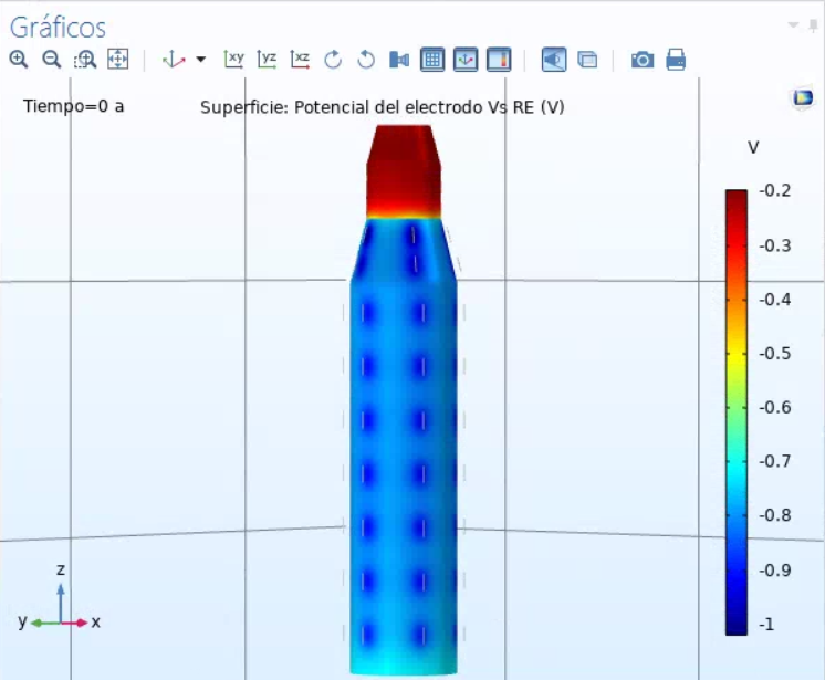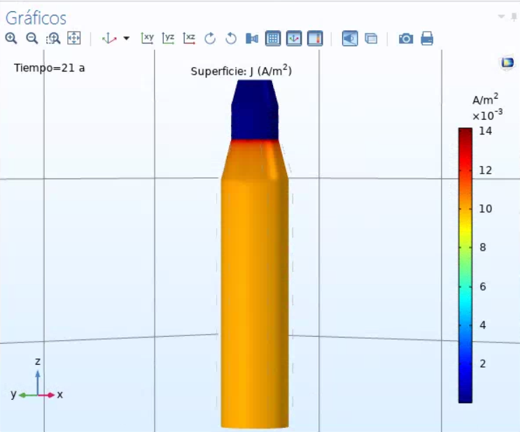A continuación se aplica pintura tipo VII-A, según NORSOK M-501, así como protección catódica por ánodos galvánicos obtenida por simulación. Se extrapola la simulación a 21 años de vida útil. Los resultados se muestran a continuación. Nótese las diferencias sustanciales en los valores de potencial de corrosión, más próximos al aluminio (en torno a -1V), así como los órdenes de disminución en las densidades de corriente y cómo se mantienen éstos en el tiempo hasta que el ánodo galvánico se disuelve por completo.