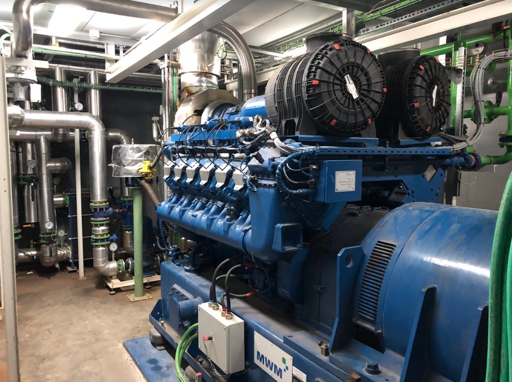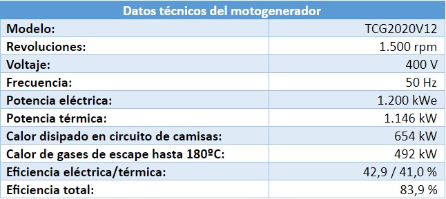 El biogás producido, acondicionado con un tratamiento para reducir el ácido sulfhídrico y regulado con un gasómetro, se usaba como combustible en un módulo cogeneración MWM TBG 620V 12K de 940 kWe y la electricidad que se generaba con dicho grupo motogenerador se utilizaba tanto para el consumo de la planta como para exportación a la red eléctrica. Gracias a la ampliación de la planta de metanización, se inició la construcción de un nuevo digestor, dando como resultado un aumento en la capacidad de producción de biogás, y por consiguiente, la instalación por parte de Caterpillar Energy Solutions de un nuevo motor MWM TCG 2020 V12 de 1.200 kWe para aumentar de esta manera la producción eléctrica y cuya puesta en marcha se produjo en julio de 2019. Dicha instalación se realizó en la sala de motores existente dentro de una cabina acústica dotada de sistema de ventilación. Este nuevo motogenerador ha supuesto una verdadera evolución con respecto a su predecesor, el TBG 620 V12K, ya que se no sólo se ha aumentado la potencia eléctrica en un 22% (260 kWe más), sino también el rendimiento eléctrico en un 4,5 puntos (42,9% frente a los 38,4% del primer motogenerador). Todo ello, como resultado a las continuas labores de desarrollo e investigación por parte de MWM para aumentar la potencia eléctrica de sus motogeneradores a la vez que se reducen las emisiones haciendo una valiosa contribución al medioambiente y garantizando, de esta manera, la alta eficiencia de sus productos.
