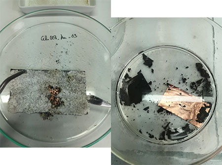 La Figura 3 presenta dos imágenes del electrodo después del tratamiento con sales fundidas. En la primera imagen se observa el electrodo cubierto de dichas sales, mientras que en la segunda se aprecia un deslaminado completo del electrodo tras su inmersión en agua, lo que permite recuperar tanto el grafito del ánodo como el colector de corriente de cobre.