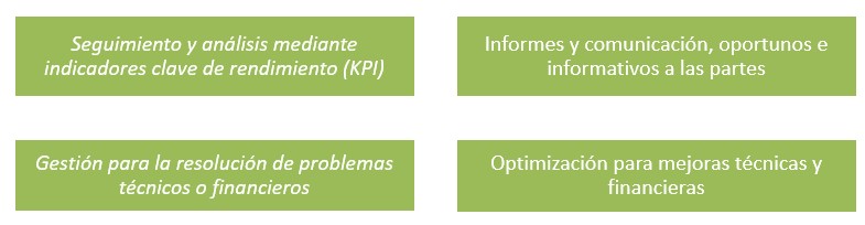 El Gestor Técnico de Activos es responsable de preparar y proporcionar informes periódicos al Propietario del Activos, responsable de los Contratos de Compraventa de Energía (PPA), contratos de interconexión, contratos de licencia de generación de energía, de la regulación específica para el sitio, de los contratos operativos vigentes, de los contratos relacionados con los servicios de operación y mantenimiento y la coordinación, del arrendamiento de terrenos, de los seguros, de la seguridad del sitio, de las comunicaciones y, en algunos casos, de los servicios adicionales.