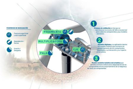 - El desgaste es un fenómeno de degradación común en todos los componentes del rotor de una turbina eólica. Aunque no se considera catastrófico, su impacto en el comportamiento de la turbina es significativo. El desgaste superficial de la pala que estudiará MGEP modifica su comportamiento aerodinámico, alterando a su vez la generación de energía y las cargas que soportan tanto las propias palas como el resto de los componentes. El desgaste del engranaje, que será abordado por Ikerlan, afecta directamente a la capacidad y resistencia de estos componentes para transmitir par y, por tanto, potencia mecánica hasta el generador.