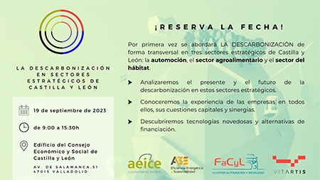 La Asociación de Empresas de Eficiencia Energética (A3E) coorganiza, junto con el Clúster de Hábitat Eficiente, AEICE; el Clúster de automoción de Castilla y León, FACYL; y la Asociación de la Industria Alimentaria de Castilla y León, VITARTIS, una jornada en la que se abordarán los retos relativos a la descarbonización a los que se enfrentan sectores como la construcción, la automoción y el sector agroalimentario.