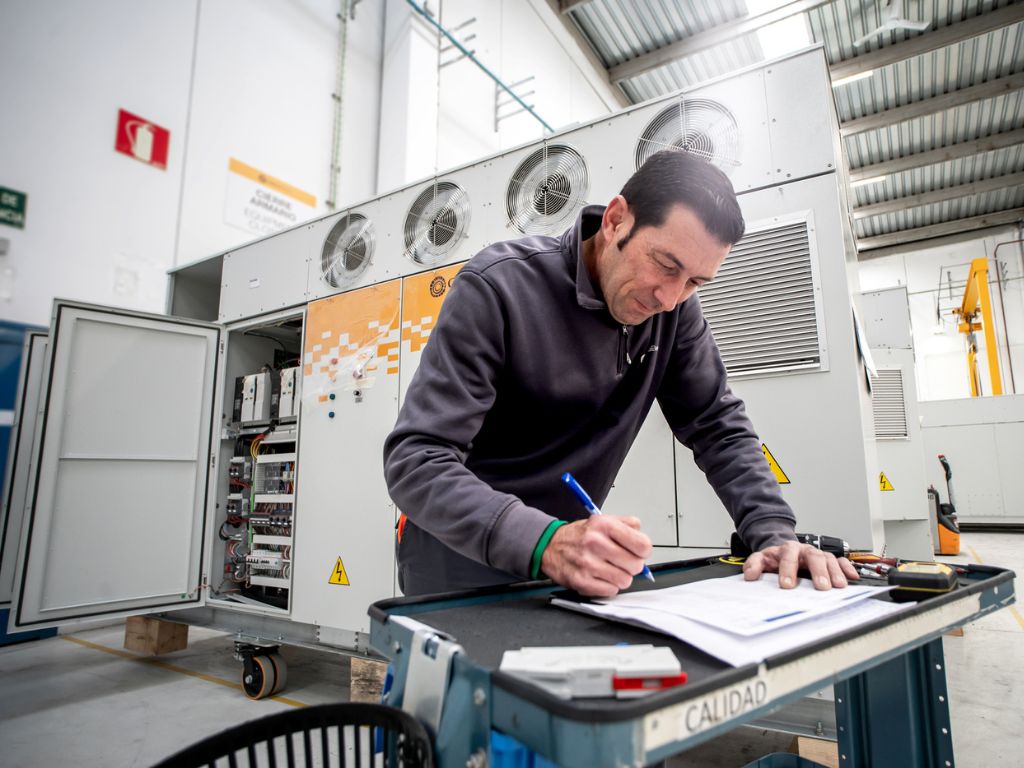 En total, esta instalación produce más de 4 GW anuales (unos 850 equipos al año) y tiene previsto aumentar de forma significativa su capacidad en el apartado de soluciones de almacenamiento en los próximos años. Cuenta con más de 250 empleados -en su mayor parte ingenieros e ingenieras- y dispone de unos avanzados bancos de ensayos tanto para convertidores eólicos como para inversores fotovoltaicos y baterías. De hecho, cuenta con una instalación que permite reproducir de forma fidedigna el funcionamiento completo de un aerogenerador eólico para probar distintos equipos, así como con grandes cámaras térmicas capaces de someter a los inversores solares en prueba a temperaturas que oscilan entre los 65 y los -25 grados centígrados.