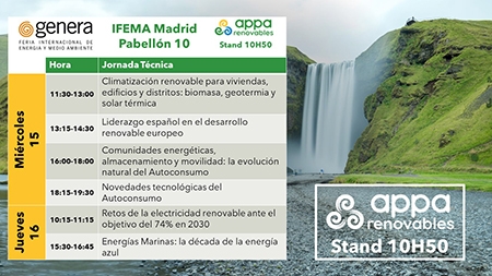 Del 14 al 16 de junio tendrá lugar una nueva edición de la Feria Genera. Este año, el autoconsumo, con un crecimiento anual en 2021 superior al 85%, tendrá un protagonismo especial. APPA Renovables organiza durante la Feria un total de seis jornadas técnicas que cubrirán distintos aspectos del desarrollo renovable como la climatización, el liderazgo español en Europa, el autoconsumo o las energías marinas.