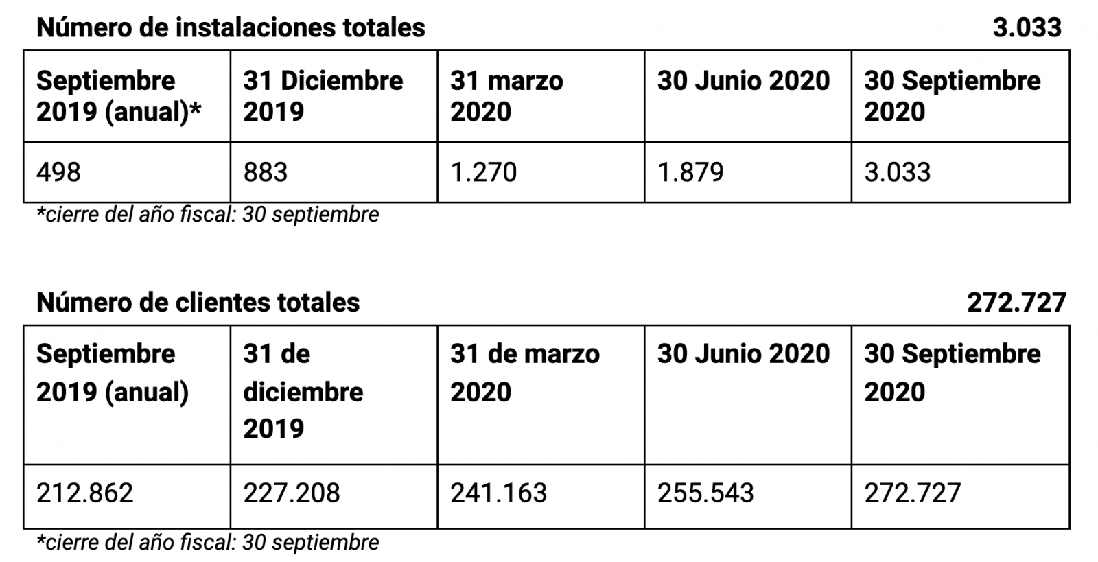 Holaluz acelera su crecimiento gracias a la gestión de 3.033 instalaciones fotovoltaicas en España a 30 de septiembre, lo que supone un crecimiento del 61% desde el 30 de junio. En relación al mismo periodo del año pasado, este crece hasta el 520%. Asimismo, el número de clientes a 30 de septiembre incrementa hasta 272.727, representando un crecimiento del 7% respecto al 30 de junio, un 65% más en relación al mismo periodo del año pasado.