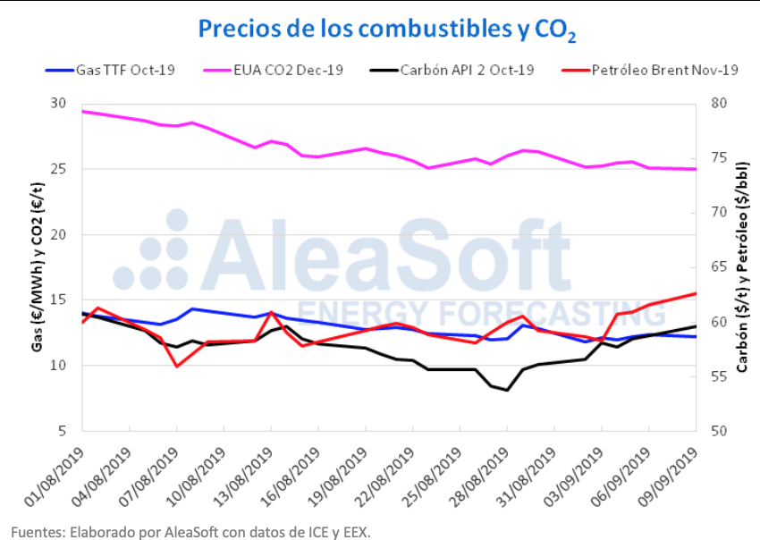 Los futuros de derechos de emisión de CO2 en el mercado EEX para el contrato de referencia de diciembre de 2019, finalizaron la semana pasada con un pecio de 25,09 €/t. Este mercado se mantuvo en torno a los 25 €/t durante toda la semana, alcanzando el precio máximo de la semana, de 25,54 €/t, el jueves 5 de septiembre, produciéndose un descenso de -0,5 €/t el viernes posterior. El precio promedio de la semana pasada para los futuros de derechos de emisión de CO2 disminuyó en un ââ?¬â??2,7% respecto al precio promedio de la semana anterior. La evolución de este mercado en estos días ha estado condicionada principalmente por las decisiones tomadas en torno al Brexit y una posible prórroga para evitar salir de la Unión Europea sin acuerdo.