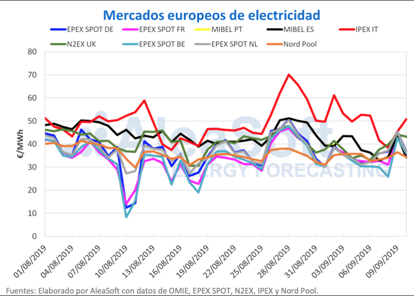Esta semana ha comenzado con importantes subidas en la mayoría de los mercados. Los precios de ayer lunes, 9 de septiembre, han subido unos 10 €/MWh respecto al promedio de la semana pasada en los mercados EPEX SPOT de Alemania, Francia, Bélgica y Países Bajos. En los mercados MIBEL y N2EX se percibió un incremento aproximado de 6,0 €/MWh y en el mercado de Nord Pool el incremento fue de 1,9 €/MWh, mientras que el mercado IPEX sufrió un descenso de ââ?¬â??4,6 €/MWh. En cambio, los precios de cierre para hoy 10 de septiembre han vuelto a bajar en la mayoría de los mercados, a excepción del mercado IPEX, que ha cerrado en 50,78 €/MWh, 5,5 €/MWh por encima del precio casado el día anterior.