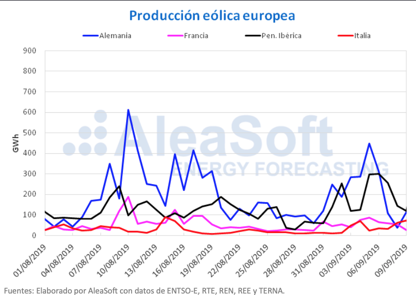 En Alemania, también se generó la semana pasada con este tipo de tecnología por encima del doble de la producción de la semana del 26 de agosto, obteniéndose 1668 GWh, que representaron un aumento del 109%. En cambio, en Francia el aumento de un 75% de la producción eólica fue un poco más discreto. Durante esta semana, en AleaSoft se espera una caída de la producción eólica en Portugal y Francia, y valores equivalentes a los de la semana pasada en el resto de los países analizados.