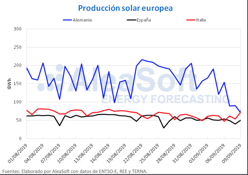 En la semana recién concluida, la producción solar en España, incluyendo las tecnologías fotovoltaica y termosolar, estuvo muy similar, solo un 0,9% mayor a la registrada en la semana del 26 de agosto. En el caso de Italia y Alemania, la generación con esta fuente renovable disminuyó en un ââ?¬â??9,5% y un ââ?¬â??22% respectivamente.