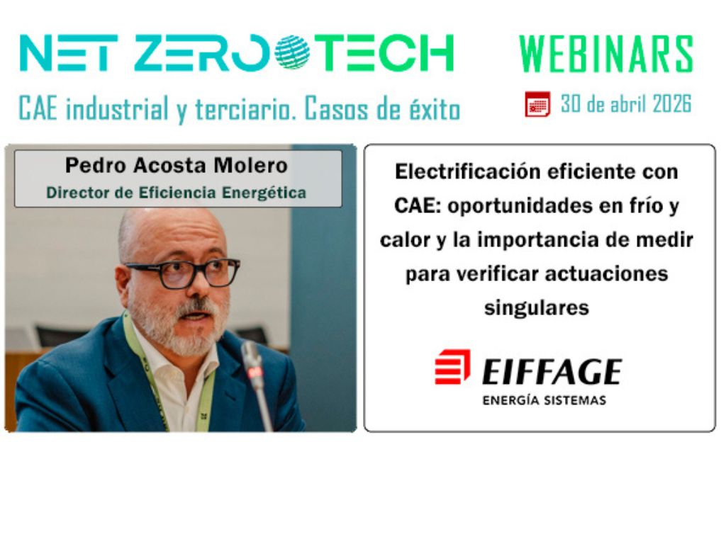 En este contexto, Eiffage Energía Sistemas presentará la ponencia ‘Electrificación eficiente con CAE: oportunidades en producción de frío y calor y la importancia de la medición’, impartida por Pedro Acosta Molero, director de Eficiencia Energética.