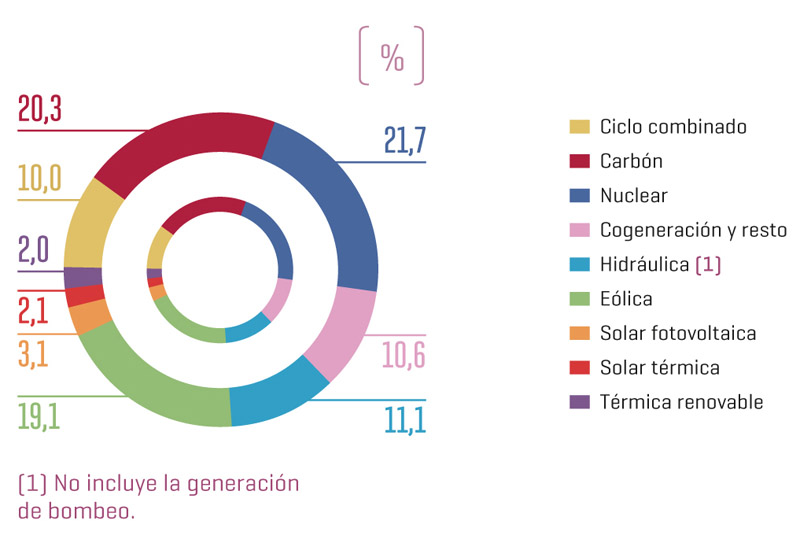 La generación nuclear cubrió este año el 21,7% de la demanda de energía eléctrica, seguida del carbón que aportó el 20,3%, la eólica el 19,1%, la hidráulica el 11,1%, la cogeneración y resto el 10,6%, el ciclo combinado el 10%, y las tecnologías solares y la térmica renovable, que cubrieron conjuntamente el 7,2% de la demanda anual, aportación similar a la del 2014.