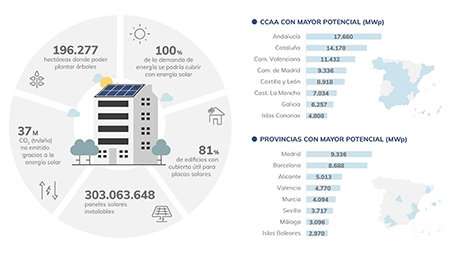 - Andalucía es la Comunidad Autónoma que dispone de mayor potencial para la generación fotovoltaica (17.660 MWp), seguida de Cataluña (14.178 MWp), Comunidad Valenciana (11.432 MWp), Comunidad de Madrid (9.336 MWp) y Castilla y León (8.918 MWp).