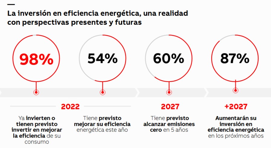 Sobre las perspectivas de inversión, España se sitúa nuevamente entre las primeras posiciones de los países encuestados. Mientras que, a nivel global, alrededor del 54% de las empresas ya están invirtiendo en mejorar en términos de eficiencia energética, en nuestro país ese dato asciende al 61%. Además, más de la mitad de las compañías consultadas (54%) tiene previsto realizar mejoras de eficiencia energética a lo largo de este mismo año y otros 2 de cada 5 (43%) planean hacerlas en los próximos 2 a 3 años.