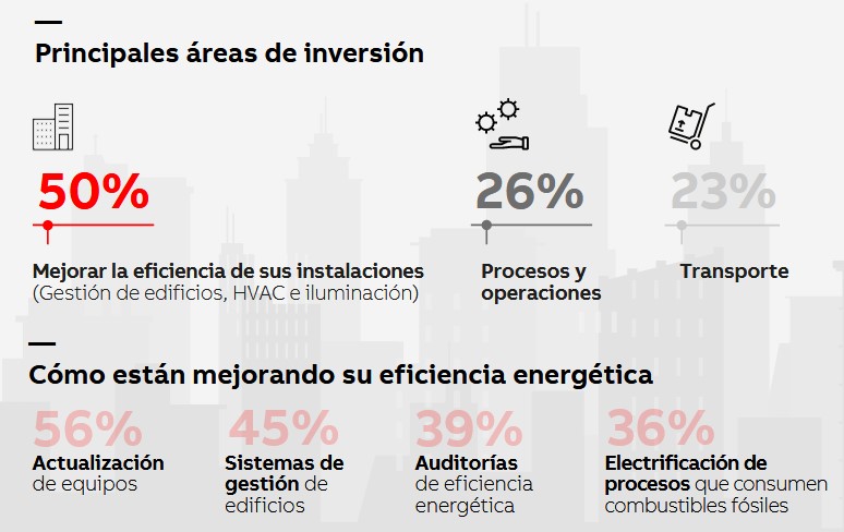 La investigación ha contado con la participación de un total de 2.294 empresas de 13 países distintos, entre ellos España, principalmente con tamaños comprendidos entre los 500 y 5.000 o más empleados. Sus resultados apuntan que el 98% de las compañías encuestadas de nuestro país ya está invirtiendo o tiene previsto invertir en eficiencia energética, ligeramente por encima de la media global del estudio (97%).
