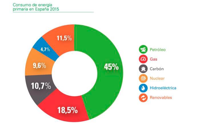 Esta modificación en el consumo ha producido cambios en la configuración del mix energético de España. En 2015, destaca que el petróleo, el gas natural y el carbón han ganado cuota en su aportación a la demanda, mientras que la energía nuclear, la hidroeléctrica y las renovables han perdido peso. Con todo, el mix energético quedó distribuido de la siguiente manera: petróleo (45%), gas natural (18,5%), carbón (10,7%), nuclear (9,6%), hidráulica (4,7%) y renovables (11,5%).