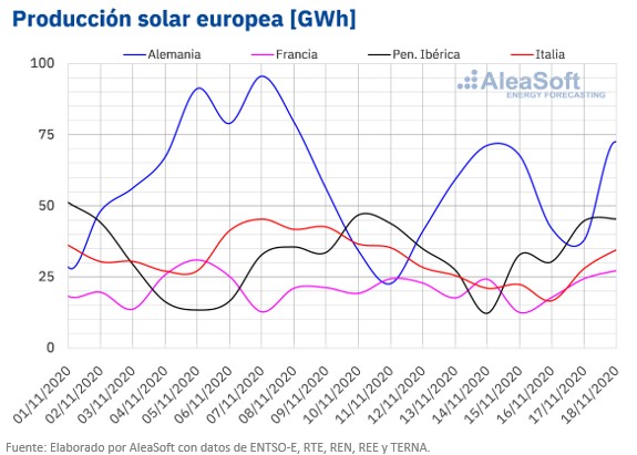 Durante los tres primeros días de la semana que comenzó el lunes 16 de noviembre, la producción solar media aumentó un 21% en la península ibérica en comparación con la media de la semana anterior. En el mercado francés la producción creció un 14% mientras que en el alemán se registró un aumento del 1,0%. Por el contrario, en el mercado italiano la producción tuvo una reducción del 13%.
