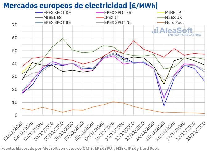 El precio promedio del 16 al 19 de noviembre fue de 42,19 €/MWh en el mercado español y de 42,17 €/MWh en el mercado portugués. Estos fueron el tercer y el cuarto precios más altos de los mercados europeos, después de los promedios del mercado italiano y del mercado británico.