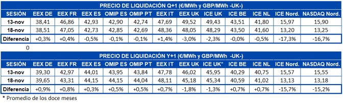 Los precios de los futuros de electricidad para el primer trimestre de 2021 se comportaron mayoritariamente a la baja en la sesión del miércoles 18 de noviembre en comparación con la última sesión de la semana precedente, del día 13 de noviembre. Los precios del mercado ICE y del mercado NASDAQ de los países nórdicos fueron los de mayor reducción, del 17%. En el resto de los mercados donde los precios descendieron, las variaciones estuvieron entre el ââ?¬â??0,1% del mercado OMIP de España y Portugal y el ââ?¬â??3,0% del mercado EEX de Gran Bretaña. El mercado ICE de Bélgica fue el de menor descenso, con una diferencia de 0,01 €/MWh. Por otra parte, los mercados EEX de Alemania, Francia e Italia registraron incrementos de entre el 0,3% y el 1,4%.