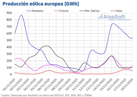 La producción eólica promedio de los tres primeros días de la semana del 16 de noviembre registró un incremento del 344% en el mercado italiano en comparación con la media de la semana anterior. En el mercado alemán se produjo también un importante aumento, en este caso del 117%, mientras que en el mercado francés el crecimiento fue más moderado, del 9,3%. Por el contrario, en la península ibérica la producción con esta tecnología disminuyó un 22%. Sin embargo, si se compara la producción ibérica de los tres primeros días de la semana con la del mismo período de la semana anterior, se produjo un aumento del 9,0%.