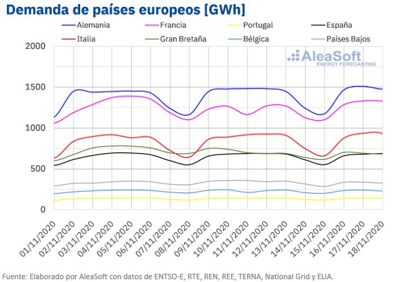 Las previsiones de AleaSoft indican que al finalizar la semana del 16 de noviembre la demanda de los mercados de Europa continuará el mismo comportamiento registrado durante los primeros tres días de la semana.