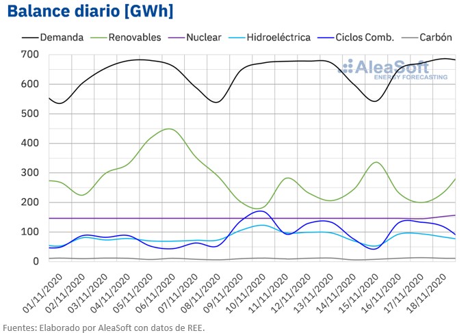 La producción nuclear aumentó hasta alcanzar un promedio diario cercano a los 148 GWh debido a que la unidad II de la central nuclear de Ascó se conectó nuevamente a las 18:04 horas del martes 17 de noviembre.