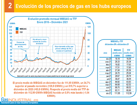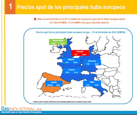 El último boletín de precios de mercados de GasINDUSTRIAL, del periodo 18 al 31 de diciembre de 2021, señala una subida media del 16,9% en los precios spot de los hubs europeos hasta los 124,04 €/MWh, 17,94 €/MWh más que el periodo anterior.