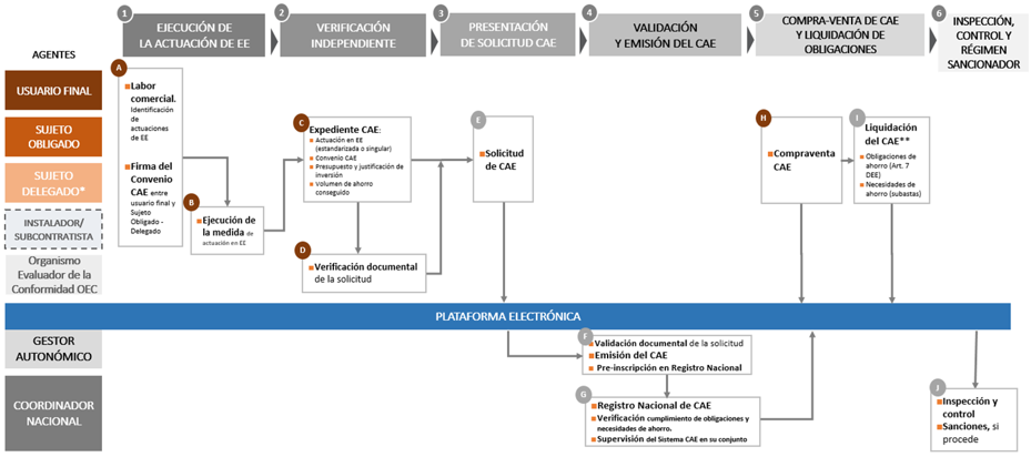 Los CAE registrados en la Plataforma electrónica podrán liquidarse, contribuyendo a cumplir las obligaciones de ahorro de las empresas, o podrán comercializarse, permitiendo que otras empresas obligadas los adquieran y procedan a su liquidación para cumplir con sus obligaciones. Los sujetos obligados podrán operar directamente o contratar los servicios de empresas acreditadas, denominadas sujetos delegados. La Plataforma permitirá inventariar a todos estos agentes y trazar las operaciones realizadas con los CAE durante sus tres años de vigencia.
