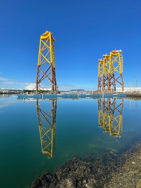 El transporte de los jackets no es la única operación logística en la que está involucrada Sarens en lo que al parque eólico de Saint Brieuc se refiere. Desde abril de 2021, la compañía europea trabaja en el puerto de Fene, por encargo de Navantia-Windar, en las labores de construcción de los jackets. En esta operación, aún en marcha, Sarens está utilizando una de las dos unidades de grúa Demag CC9800 existentes en el mundo para la elevación del módulo superior de cada jacket, con un peso de 600 toneladas, y su colocación a más de 70 metros de altura.
