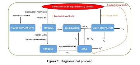 El objetivo del proyecto ha sido la investigación base en los métodos óptimos de generación de hidrógeno a partir de mezclas de residuos, y tratados por medio de procesos de gasificación, que de otro modo acabarían en vertedero o incinerados. Como tecnologías de proceso, se ha combinado la pirólisis y gasificación con electrólisis SOEC como coadyuvante para el aporte de hidrógeno y oxígeno. La información de operación del proceso de testeo de revalorización de residuos para obtención de H2 se ha utilizado para la creación de un modelo de simulación de la parte del proceso específica de generación de hidrógeno.