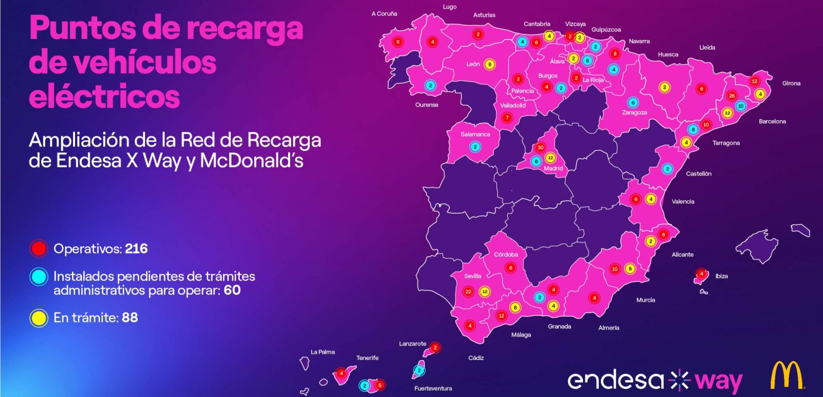 La colaboración de Endesa X Way y McDonald’s sigue dando sus frutos. Gracias al compromiso por la sostenibilidad conjunto y el impulso de la movilidad eléctrica, están desplegando una red de recarga de vehículos eléctricos que ya cuenta con 276 puntos instalados en los aparcamientos un centenar de restaurantes de McDonald’s por toda España. De ellos, 216 puntos de recarga ya están totalmente operativos y el resto, se encuentran a la espera de que se cumplan todos los procesos de permisos y autorizaciones administrativas para empezar a recibir energía y así poder ponerse al servicio del público. Y este año se seguirán sumando cargadores en nuevos establecimientos.