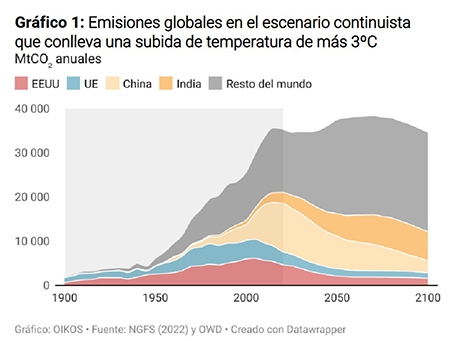 El informe parte de los análisis realizados por prestigiosas entidades, entre ellas la Network for Greening the Financial System (NGFS), el grupo de trabajo de los principales bancos centrales y científicos climáticos, que establece escenarios que oscilan entre las políticas actuales de descarbonización en el ámbito (Current Policies), una transición desordenada y fragmentada (Divergent Net Zero) y una acción inmediata y ordenada que lograse alcanzar los objetivos de París (Net Zero 2050).