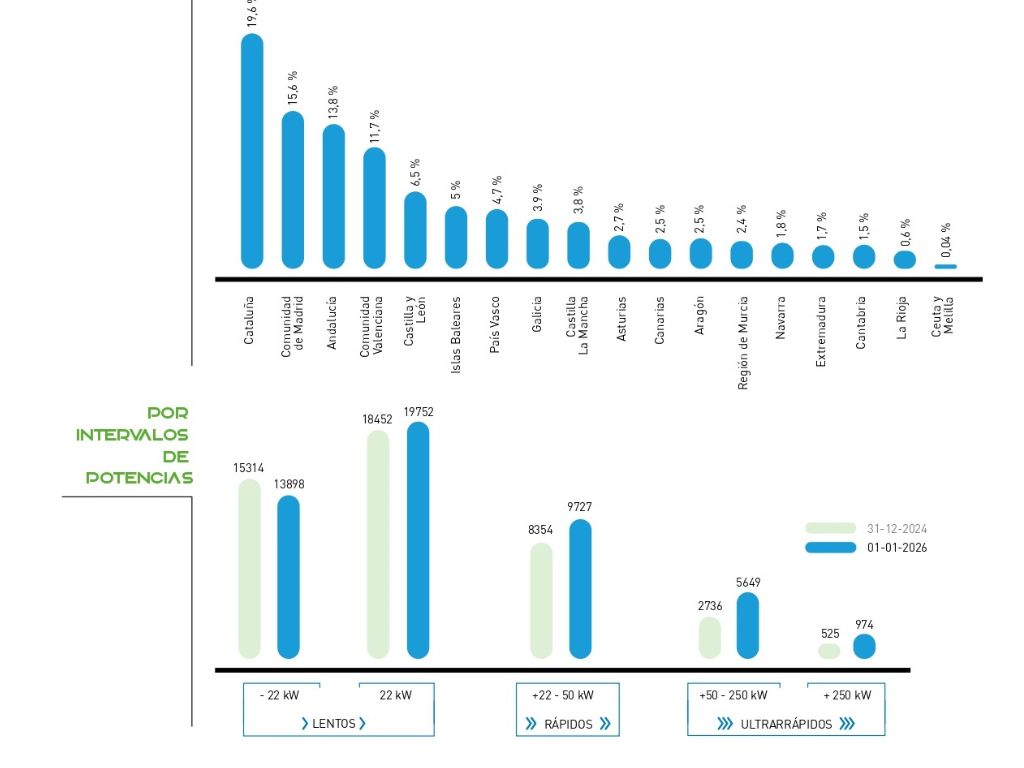 El dato más significativo para el sector es el cambio en la tipología de las instalaciones. Los puntos de recarga que han experimentado un mayor crecimiento son los de alta potencia, esenciales para la rotación de vehículos y los viajes de larga distancia.
