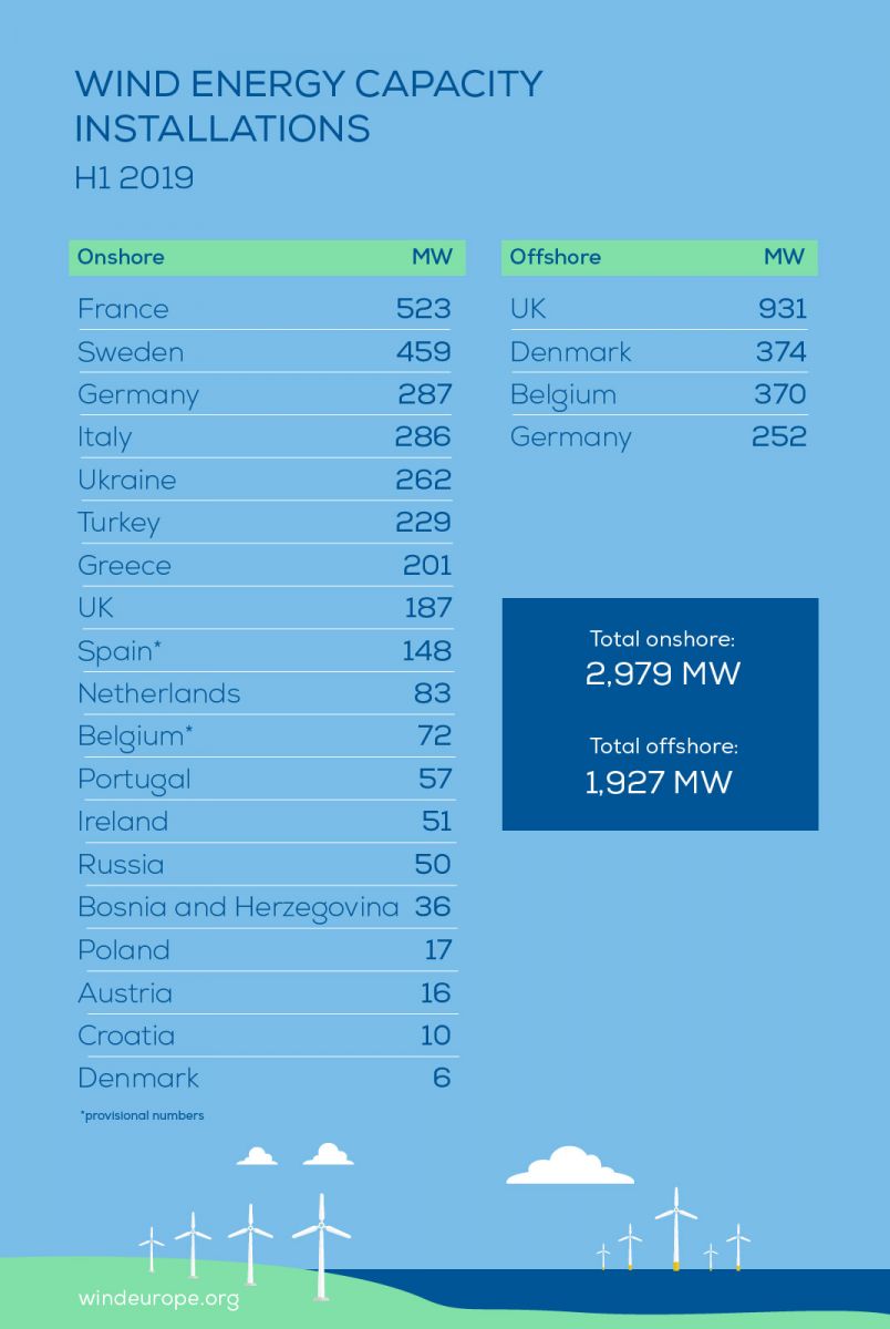 En el primer semestre del año se instalaron 1,9 GW de energía eólica marina, frente a los 1,1 GW añadidos en el mismo período de 2018. Reino Unido (931 MW), Dinamarca (374 MW), Bélgica (370 MW) y Alemania (252 MW) fueron los países con mayor número de parques nuevos. Esto incluye Hornsea 1 en el Reino Unido que, una vez terminado, será el parque eólico más grande del mundo con 1,2 GW.