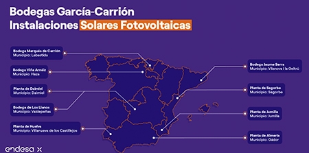 La bodega García-Carrión sigue apostando por la descarbonización y ha aumentado su generación de energía renovable en sus centros de producción de España después que Endesa X, la filial de servicios energéticos de Endesa, haya puesto en marcha nueve instalaciones solares fotovoltaicas para autoconsumo en cada una de estas naves. Las plantas solares, que ya están totalmente operativas, suman una potencia total de 18,16 MWp, lo que lo convierten en uno de los proyectos de autoconsumo empresarial más grandes y en un referente para el sector vinícola.