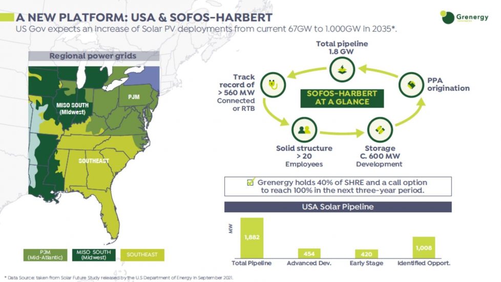 Grenergy ha entrado en el mercado de energía renovable de Estados Unidos con la compra del 40% de la desarrolladora de proyectos fotovoltaicos y de baterías Sofos Harbert Renewable Energy (Sofos Harbert) con sede en Birmingham -Alabama-.