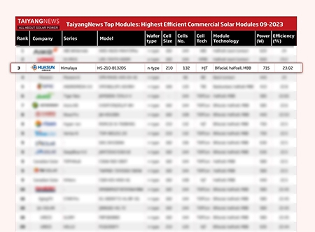 Continúa la tendencia hacia los módulos de muy alta eficiencia en la lista de los Top Solar Modules de TaiyangNews de septiembre. Huasun Energy ha saltado al tercer puesto de un total de 51 módulos incluidos en la lista tras aumentar su eficiencia cerca de 0,5 puntos porcentuales, hasta el 23,02%.