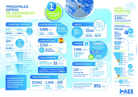 2022 fue un año relevante para la eólica en España con un incremento de potencia de 1.640 MW. A 31 de diciembre de 2022, España contaba con 29.813 MW eólicos en total. La generación eólica fue de 61.069 GWh, lo que supone una cobertura de la demanda del 24%. La energía eólica fue la segunda tecnología de generación.