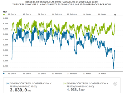 Según un comunicado de ACOGEN (Asociación Española de Cogeneración), tras la paralización de las actividades no esenciales la cogeneración el 75% de la producción, en relación con la del mismo periodo del año pasado. Desde el estado de alarma, la producción ha caído un 15%. Para Javier Rodríguez, director general de ACOGEN, “son cifras preocupantes pero denotan una fuerte resiliencia y actividad en industrias clave en el mercado nacional”