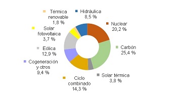 Por tecnologías, el carbón ha liderado en julio la generación eléctrica con un porcentaje del 25,4% sobre el total. Se trata de un porcentaje muy superior al de la media de anual de generación con carbón, que se sitúa en el 18,4%.