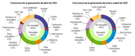 En el mes de abril, y según datos estimados a día de hoy, la generación procedente de fuentes de energía renovable representó el 46,2 % del mix. Durante este mes, se produjeron un 11,1 % más de GWh verdes que en el mismo periodo de 2020.