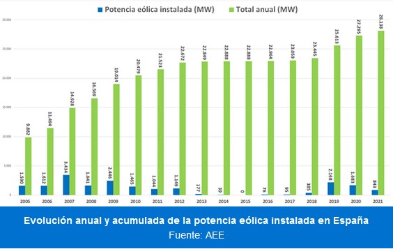 La potencia eólica instalada en España alcanza los 28.138,1 MW con 842,61 MW nuevos en 2021. En relación a la aportación de las tecnologías renovables, la eólica ha aportado el 49,23% del total, siendo la primera tecnología de las renovables, seguida de la hidráulica (26,19%) y la fotovoltaica (16,88%).