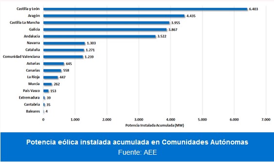 En España, la energía eólica tiene presencia en prácticamente todas las comunidades autónomas, exceptuando Madrid, Ceuta y Melilla. Durante 2021, las comunidades autónomas que más eólica han instalado han sido Aragón (275,7 MW), seguida de Castilla y León (155,4 MW), Asturias (126 MW), Canarias (104,4 MW), Galicia (68,9 MW), Castilla-La Mancha (68,7 MW) y Andalucía (43,5 MW). Por su potencia eólica total instalada, Castilla y León se mantiene en primer lugar con 6.403 MW, seguido de Aragón (4.435,4 MW) y Castilla-La Mancha (3.954 MW).