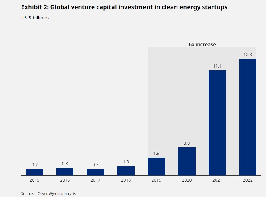 La inversión del capital riesgo en startups de energía limpia ha aumentado de manera drástica en los tres últimos años, multiplicándose por seis hasta 12.300 millones de dólares en 2022 desde 1.900 millones de dólares de 2019, según el estudio ‘Clean Energy Startups Radar’ de la consultora estratégica Oliver Wyman.