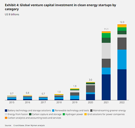 “La energía solar y la eólica, aunque son tecnologías más maduras, aún deben superar su problema de intermitencia mediante soluciones de almacenamiento. Esta es una de las razones por las que más de dos tercios de la financiación mundial de capital riesgo para energías limpias en 2022 se destinó a baterías, almacenamiento y energías renovables”, explican desde Oliver Wyman.