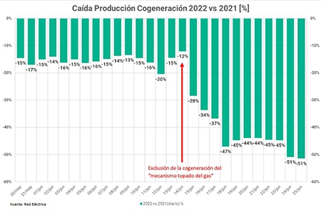 Desde la aprobación del mecanismo de compensación del mercado eléctrico —“topado de gas”—, el pasado 14 de junio, la electricidad producida mediante cogeneración ha caído en picado un 50% (ver gráfico al final de la nota). Es la generación a gas más eficiente del país, que utiliza el 20% del consumo de gas nacional y produce el 11% de la electricidad y el calor que utiliza el 20% del PIB industrial español, en más de 600 fábricas.