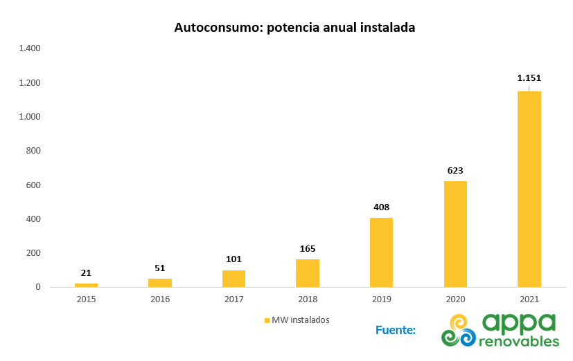 La apuesta por el autoconsumo se afianza en España. Con un crecimiento del 85% respecto al año precedente, en 2021 se instalaron 1.151 MW de potencia en instalaciones de autoconsumo. El sector residencial, clave en el aumento de estas cifras, supone ya el 22% del total (253 MW). El ámbito doméstico estuvo muy condicionado por los altos precios del mercado eléctrico y el autoconsumo se ha identificado claramente como una forma de conseguir grandes ahorros en la factura eléctrica. Desde 2017, la potencia anual instalada ha experimentado fuertes crecimientos, multiplicándose por diez en los últimos cuatro años.