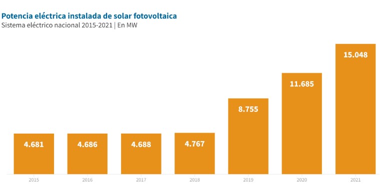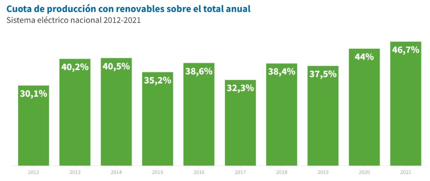 En 2021, las tecnologías renovables continuaron su crecimiento en el parque generador del país: a cierre de año, representaban el 56,6% de la capacidad de producción nacional (112.846 MW). En total, el sistema eléctrico nacional ha sumado este año pasado más de 4.000 nuevos MW renovables alcanzando así los 63.896 MW de capacidad verde.