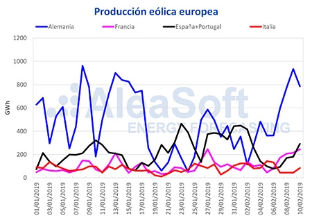 En la segunda semana de febrero hubo un repunte en la producción eólica sobre todo en Alemania donde se alcanzaron los 934 GWh el 9 de febrero. En el conjunto de la Península Ibérica, España y Portugal, al igual que en Francia, los valores más altos de producción eólica se alcanzaron el 10 de febrero con 291 GWh y 245 GWh, respectivamente. Para la semana del 11 de febrero se espera que la producción eólica no sea tan alta.