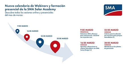 A esta formación presencial después le seguirán tres webinars: “Aprende a dimensionar tu sistema fotovoltaico con SMA Sunny Design 5.3“ (16 de marzo), “Criterios para la selección de inversores para parques FV Large Scale“ (23 de marzo) y, finalmente, “Hibridación en las plantas de generación“ (30 de marzo).